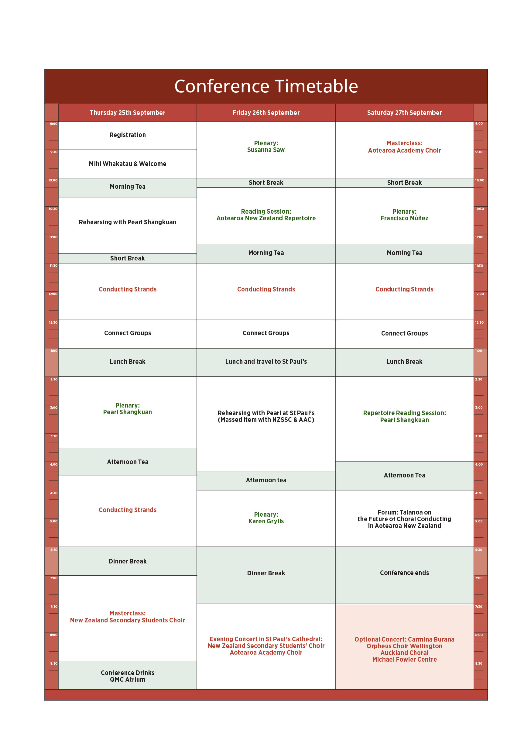 Talanoa on the Future of Choral Conducting in Aotearoa New Zealand – As we close the conference, this talanoa invites all delegates into a shared conversation about the future of choral conducting in Aotearoa New Zealand. What kind of training do our conductors need, and how do we make it accessible and rigorous? How can we better support one another in sustaining careers in a field that often lacks formal pathways and faces increasing financial pressures? And what role should the Association of Choral Directors play in advocating for, resourcing, and developing our professional community? This open dialogue is a chance to reflect, challenge, and collectively imagine the future of our craft.