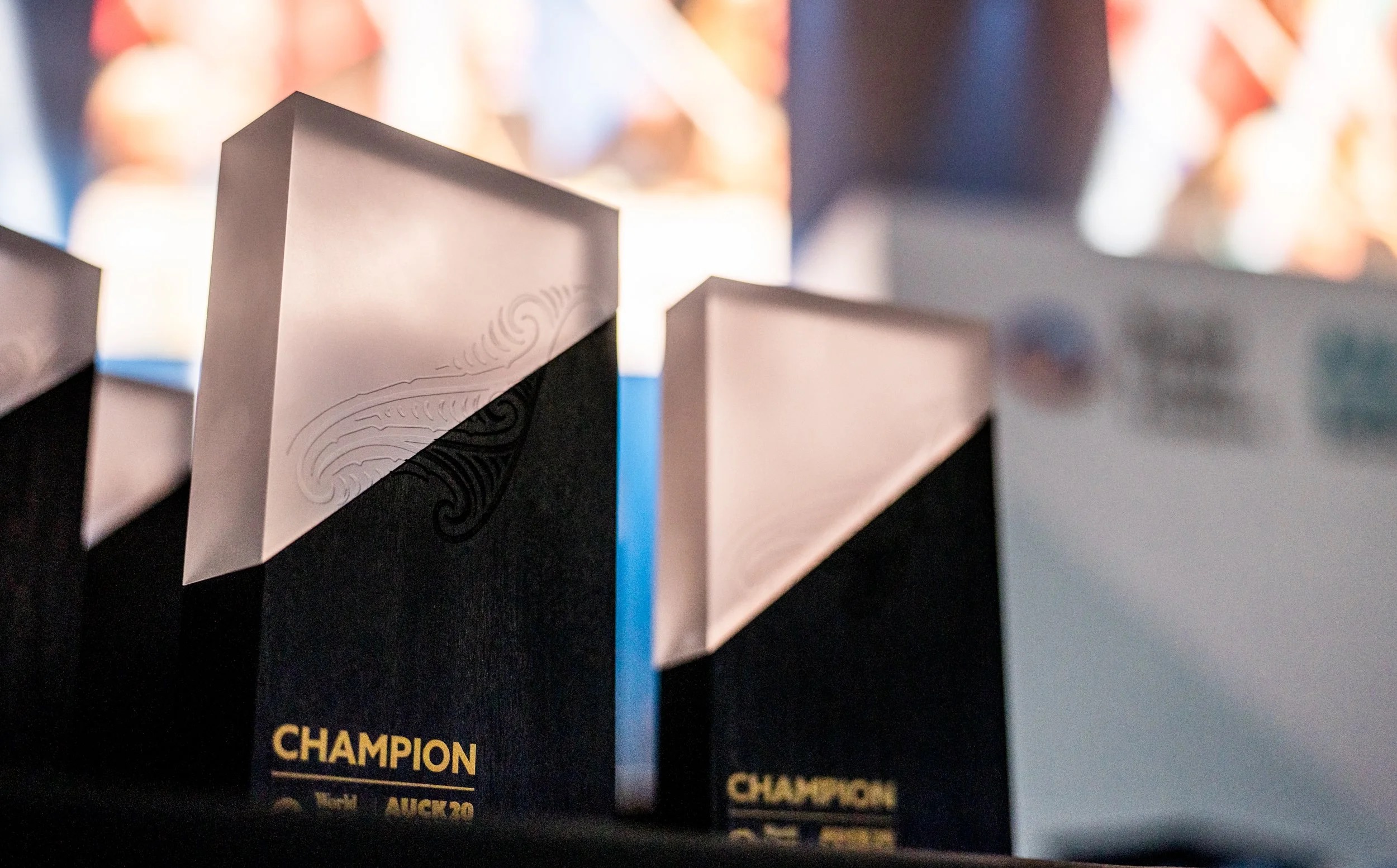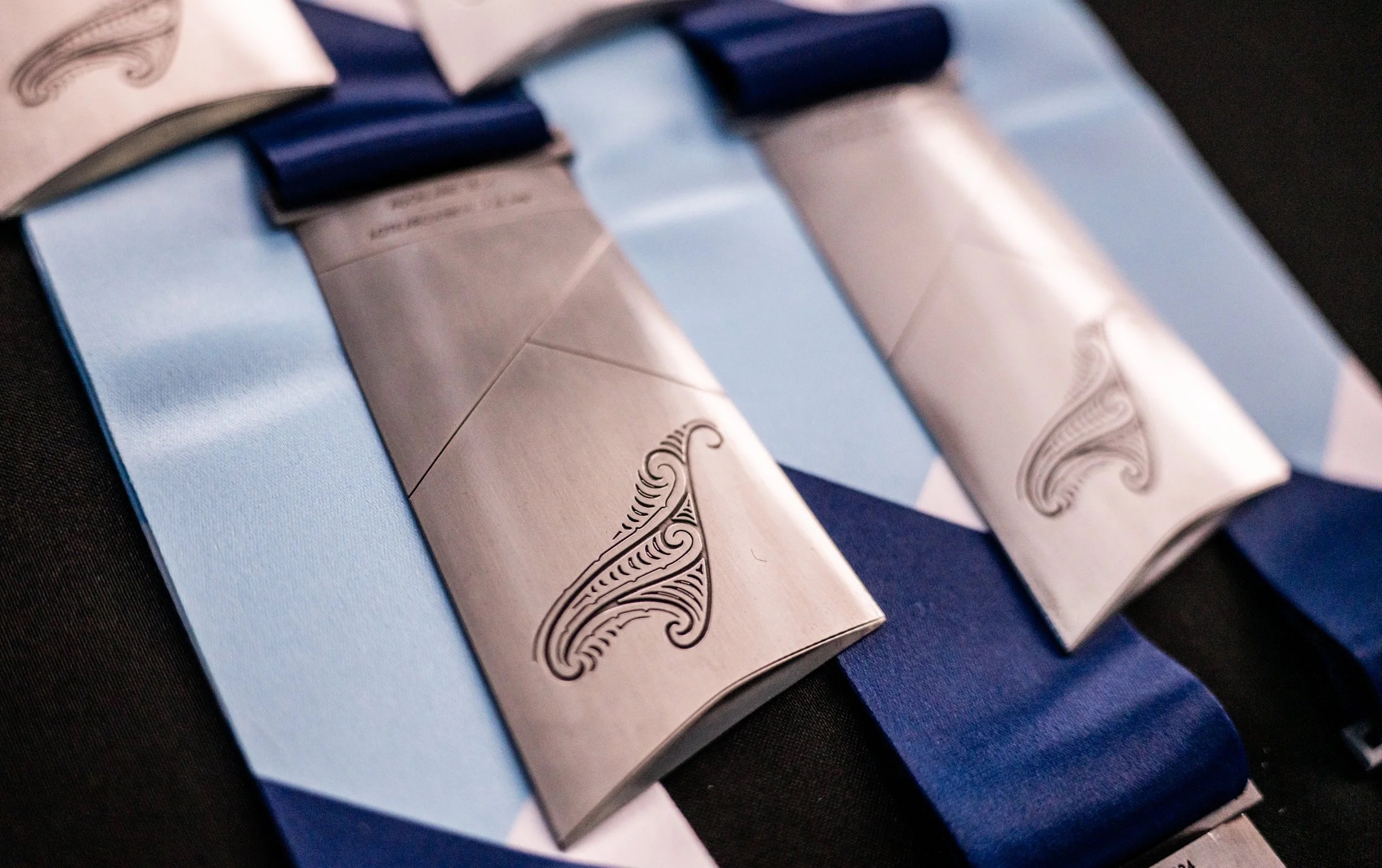 New Zealand creative agency Curative designed the trophies and medals won by choirs competing in the Champions Competition categories. The trophies were designed to reference two key natural features of Aotearoa, the land and the sea. The base was made from a recycled native hardwood to represent the land, and the top section formed from cast resin, which was sandblasted to give a sea-salty, semi- opaque finish. Graham Tipene’s ‘wave’ design lies across both sections of the trophy.