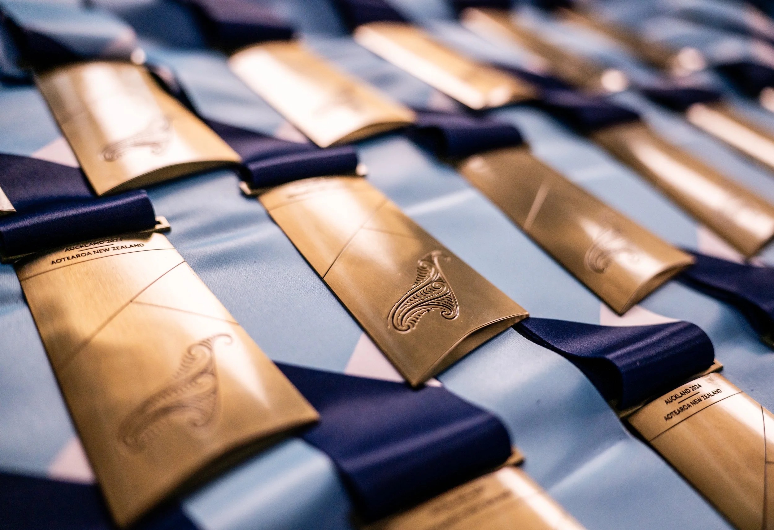 The medal's shape was designed to reference the toki (adze). Etched angles created a sense of thatching, the traditional binding methods used on the toki, and the ribbon used the brand’s core woven design. Winning choirs were presented with a single large medal and singers could purchase smaller medals as souvenirs.